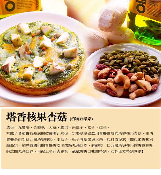 厚皮-塔香核果杏菇(植物五辛素):麵粉、糖、鹽、發酵粉、迷迭香、洋蔥、甜椒、義式香料、杏鮑菇、九層塔、大蒜、核果、起司