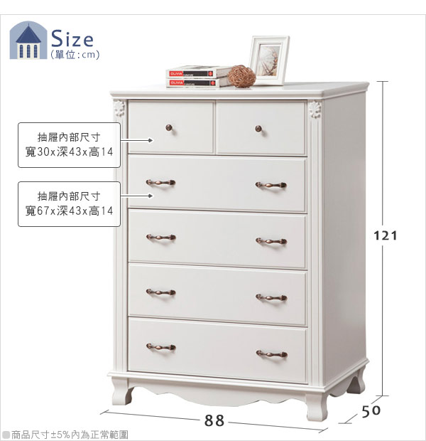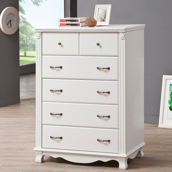 琳達五斗櫃,搭配自然的雕花裝飾,線條流暢的波浪飾板,在整體單純明亮的烤白色中,深鐵色的古典把手發揮畫龍點睛的效果,散發恰如其分的低奢華感;六大抽屜的空間,實用功能毫不馬虎,無論是衣物或生活用品,皆能完美收納。