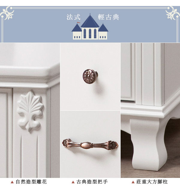 本系列尚有床組、衣櫃、化妝台、書櫃等同款商品可供選購,無須繁複昂貴的裝潢,換個傢俱就換個心情,當新古典主義遇上現代簡約設計,搖身一變為中性的輕古典風,含蓄而內斂的優雅氣質,悄悄地吸引著你深藏於內心的貴族靈魂!