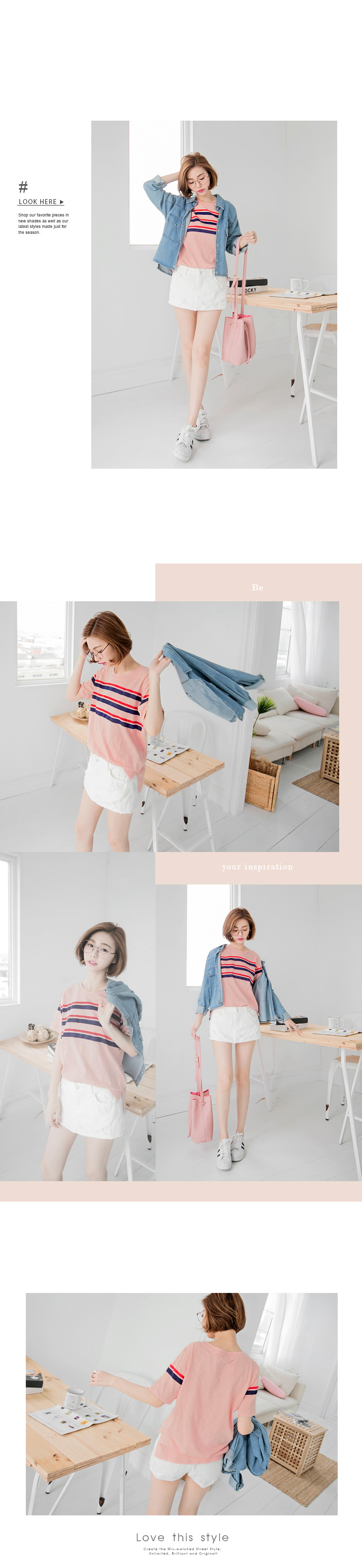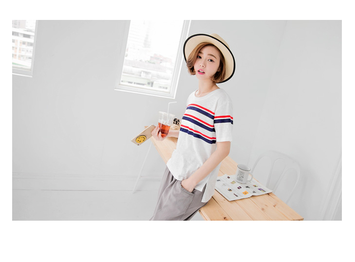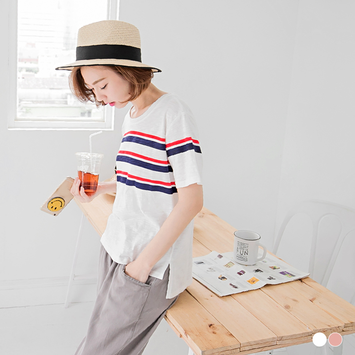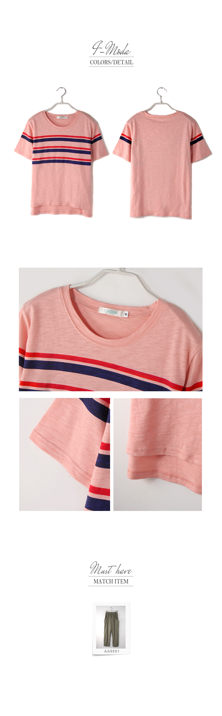 0513新品 撞色條紋前短後長側擺開衩竹節棉上衣.2色