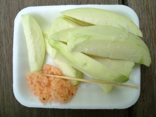 青芒果吃起來像極芭樂的感覺,不會酸--脆脆的--沾這辣椒糖吃--超正點的喔!