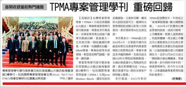 台灣專案管理學會(TPMA)2023/12/29 日於高雄圓山大飯店舉辦專案管理學刊復刊發表會,在專家學者眾志成城下讓學刊重磅回歸,意義重大,包括國際專案管理協會(IPMA)主席 Jesus Martinez Almela、國安局前局長楊國強、立委林岱樺、輔英科大張可立副校長、龍華科大管理學院院長陳元和等人均致賀詞。產官學研等 50 多位出席見證。尤其復刊第一期收錄國防專案、IT專案、知識體系回顧、HRM專案、專案技術等各項領域,都是當前熱門議題,值得一讀再讀。