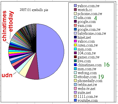 我不是學統計的,只是用同是外行人的方法弄出讓人較容易理解的方法來看網路市場,方便自己參考,也提供有興趣的網友參考。所以,沒有公布各網站比率細節,只提供派餅和大家分享。