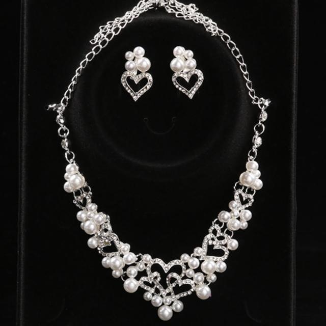 【Angel】愛情來了心型珍珠水鑽婚宴耳環項鍊2件套組(白金色針式套組)好用