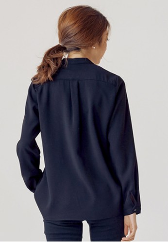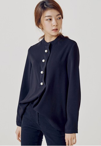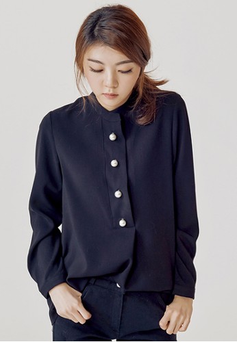 - 圓領,長袖,寬鬆適中。前置單排珍珠紐扣系合,使其成為穿著的亮點,這件襯衣也適合作為辦公穿著。