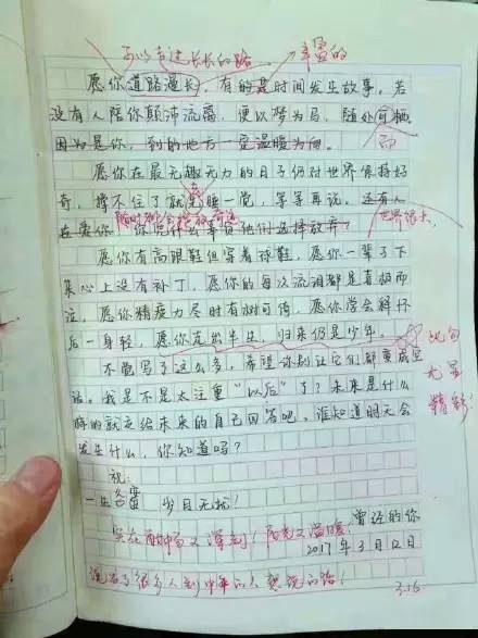 願你道路漫長(老師批改:可以走過長長的路),有的是(老師批改:豐盈的)時間發生故事。若沒有人陪你顛沛流離,便以夢為馬,隨處可(而)棲。