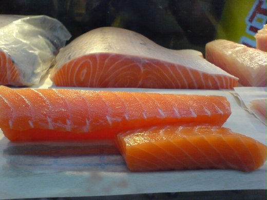 (這是最近常光顧的一家生魚片店櫥窗內的新鮮鮭魚肉,好像紅蘿蔔喔