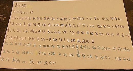 前言:此位學生在考試時候容易緊張,因此每次小考成績都還不錯,但每次到大考時總是會失常,尤其以數理更是明顯,經參加全科學管之後,考試一次比一次都還要好,終於開花結果,家長也很謝謝補習班。
