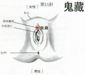 11針a、鬼藏【女】。第11針b、鬼藏【男】。12針、鬼臣。 13針、鬼封。(主治 heal):1、精神病。2、憂鬱症。3、燥狂症。4、風癲症。5、小腸症。(方法 method):1、針刺。2、點穴。3、指壓。4、按摩。5、藥餅灸。視穴位、症狀而定,由專門醫師治療使用之方法。(應用 application):1、以上13鬼穴是症狀的集合穴,應視病情選擇配穴及方法而診治。2、以上13鬼穴的單一穴位可以與其他經絡之穴位配穴,組成另一穴道處方,治療其他疾病。 第11a針、鬼藏【女】。第11b針、鬼藏【男】。 |