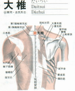(1)【大椎穴】: 詳細說明大椎 Ta 4 Chui 1 (Pm14) 督脈 又名百勞。手三陽大腸、三焦、小腸。足三陽胃、膽、膀胱與督脈之會穴。 (主治) 1、感冒common cold 2、間歇熱aglid fever 3、肺氣腫pulmonary emphysema 4、肺結核tuberculosis 5、衄血epistaxis 6、嘔吐vomiting 7、黃痰jaundice 8、癲癇熱病covulsion caused by high fever。 (取穴) 1、正坐頸向前俯,於胸椎thoracic第一節之上陷中取之 2、頸椎cervical第七節之下陷凹中取之。 (方法) 1、放血。 2、針4~6分,灸10~20分鐘、灸3~5狀。 (應用) 1、大椎:主瀉胸中之熱:治五臟之發炎,全身之疼痛,風寒熱氣及氣短不言語。 2、大椎:為手足三陽與督脈之會穴,純陽主表,凡外感六浮之在於表者,皆能紓解治病。 3、大椎:全身治療必用穴。各種神經症有鎮靜作用,扁桃腺炎,一切寄生蟲有特效。 4、溫瘧疾:在發作前2~3小時前,先刺1大椎、並灸2~3狀,2針間使、3後谿。 5、尿毒症,全身浮腫、昏迷不醒:1、先針、後灸大椎。2、百會,使清醒嘔吐止,再行治療。 6、流行性感冒、熱高39度以上: (1)先針大椎,2小時內既退熱,頭痛、鼻塞、流涕亦可消退。6~15小時可正常。 如在 2~4小時內又發作。出現頭痛咳嗽、食慾不振時,加刺(2)足三里、(3)合谷、(4)內關。既癒。 7、小兒中暑、神昏不語、四肢厥冷:針1大椎。2中脘。3氣海。 8、高血壓:針1百會。2通天。3後頂。4絡卻。5大椎。6合谷。7足三里。 (方法) 豪針切指法進針:沿皮向後斜針刺:1百會、2通天、3後頂各三分,4絡卻沿皮刺四分、5大椎直刺八分、6足三里針一吋、7合谷針一吋。 每兩天針一次。 9、感冒劇熱,局部疼痛,用梅花針在大椎穴及周圍行點刺法。 10、肺炎:主要穴1大椎、2陶道、3風門、4肺俞、5尺澤。 次要穴:1合谷、2列缺、3太淵。 補助穴:1膏盲、2豐隆、3曲池、4手五里、5委中。 (2)【風池穴】