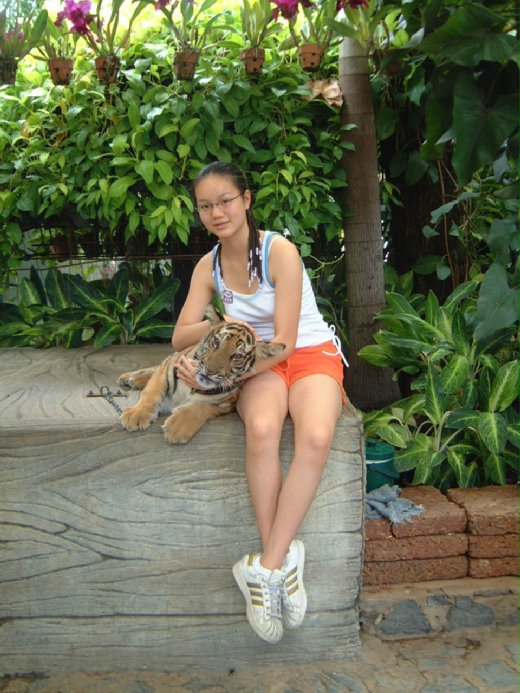 圖一:小豆與可愛又溫馴的小老虎合影,後來她說,摸過它的手好臭,急著找