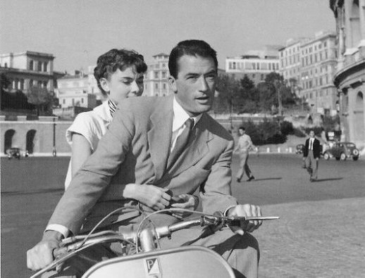 「羅馬假期」是1953年的一部電影,由葛雷哥萊畢克與奧黛莉赫本主演,奧黛莉赫本號稱是全世界至今最讓人贊賞的美麗女明星,拍此部電影時正值年輕活潑與豔光四射的時期,片中她演一位歐洲的公主到羅馬去訪問,有一天偷溜出旅館到外面亂逛,結果碰到了葛雷哥萊畢克飾演的記者,這位記者原先並不知道赫本是一位公主,後來知道了,為了私下搶新聞,而騎著偉士伯機車,戴著公主到羅馬各處觀光,公主後來被找到了,兩人的邂逅隨之終結。
