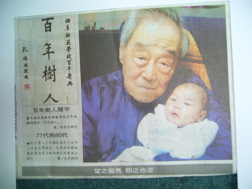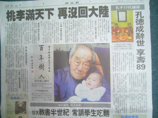 昨天(971029)聯合報報導: 孔德成辭世 享壽89 想起本部落格的前文,覺得對 至聖先師孔子與他第七十七代嫡孫對中國人的貢獻及孔德成先生對抗共產黨,維護孔孟道統存留台灣的精神,值得生長在台灣的人感恩,尊從,特此再"布"一次!同時,深深盼望:陳雲林先生雖不是為"政治"來台灣,我仍希望他能為共產黨對中國人及中華文化的倒行逆施誠懇道歉,如得孔家家屬諒解,同意,親向 孔德成先生靈前代共產黨叩首請罪! 97年2月17日聯合報登載97年2月17日聯合報登載97年2月17日聯合報登載「孔子世家譜」第五次續修工作,去年底結束登記,正式進入編修,估計世家譜收錄孔氏族人超過200萬人,從兩千五百年前至今,孔子世家已繁衍到83代,破金氏世界紀錄列為「世界最長家譜」。 孔子的人生真是精彩,可喜可賀! 同為中華民族,深覺與有榮焉! 此事讓我想起「我堅信的浪漫」一文,再貼來與好友共享! |