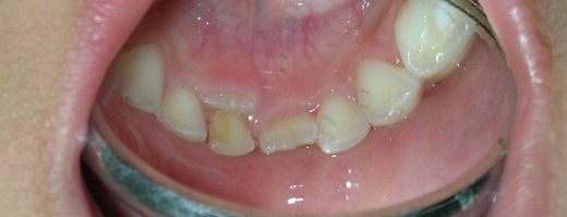 三、上顎恆門牙不但牙齒好大,牙縫也大,又歪又斜,顏色又黃,怎麼刷都刷不白------七足歲時上顎正中門牙開始萌發,由於它通常的萌發路徑是呈向外展開的方式(即八字型)所以萌發後牙齒各自向左向右傾斜,因而造成牙縫過大<圖3>,難看,根據民間說法,這是漏財縫啊!這還得了!不知急壞了多少父母;其實沒那麼嚴重啦,多數兒童會因上顎側門牙萌發時推擠正中門牙而使牙縫及牙齒的歪斜舒緩些,到了上顎恆犬齒萌發時又會對門牙群產生推擠,因而使前述的異常自然地回歸正常。但是如果上顎正中門牙之間發生狀況------如贅生牙(多長出來的牙齒<圖4>)、牙瘤或囊腫等------則側門牙及犬齒萌發所產生的推擠恐怕仍「力有未殆」,以致美觀上難看依舊,因此,當家長們焦急地帶著七、八歲的孩子來「矯正」時,醫師通常會先照攝X 光片,確定正中門牙附近區域有無狀況,若有;則需先行除去(通常以手術方式),若無,則繼續觀察等待「自然的矯正」當然也有少數的病例在恆犬齒萌發完全後牙縫過大仍未見改善,而需以齒列矯正來治療,但仍為時不晚。