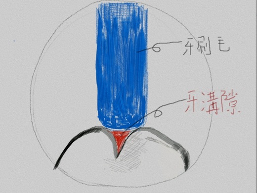 由於牙齒發育的關係,不論是乳牙的臼齒或恆牙的小臼齒及大臼齒的咬合面都滿佈著又細又深的溝隙(圖1),連最細的牙刷毛,尺寸都比溝隙大很多,更本無法深入其中清潔(圖2),但是蛀牙菌的尺寸非常小,所以輕易就能定居其內,而這些天生的”缺陷”,又經常”陷住”食物殘屑,持續的供應養分給蛀牙菌。如此容易藏汙納垢,卻又難於清潔,所以成為牙齒最容易發生蛀牙的地方。
