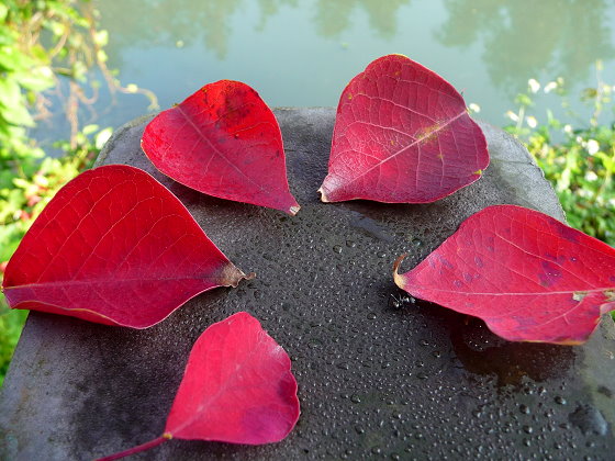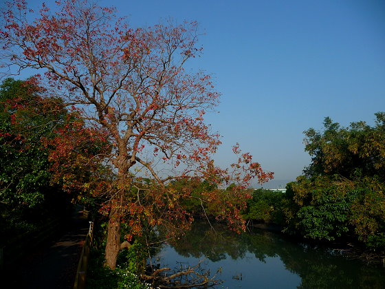 如解說牌所言,春天苦楝花景是九份溝的特色。但去年冬天我遇見隱藏在水邊另一項自然美景,灑了一地的烏桕紅葉。這棵烏桕樹約有十幾公尺高,生長在九份溝水邊,它的位置 依照經驗法則大多出現在水近處,如關渡堤防和一些山溪旁,都能看見烏桕蹤影。葉略呈菱形,入秋後轉綠為紅,去年就是在入冬後,看見鋪滿自行車道的季節紅葉。烏樁葉子比楓葉多了一點光滑,循著大自然規則,帶了點豐富善變。形狀即方又圓滑,添上冷涼色彩更是深淺交織出美麗顏色。五分港自行車道上騎行單車,只要不偷懶,一定會在冬日時分,踩過層層交疊的紅色地毯,陽光拌著冬葉散落,抬頭深呼吸,感動,俯拾皆是。
