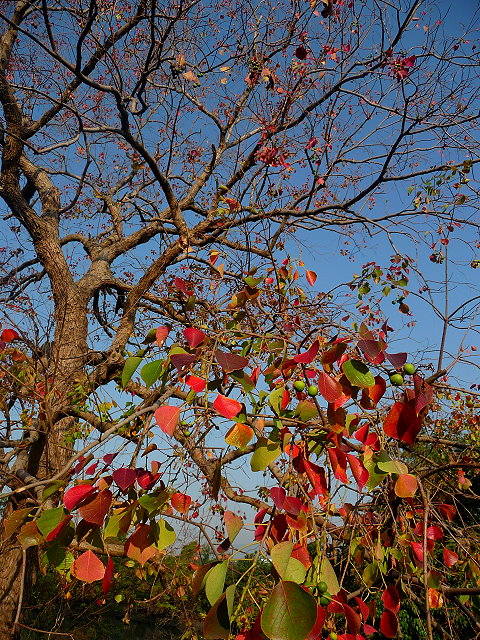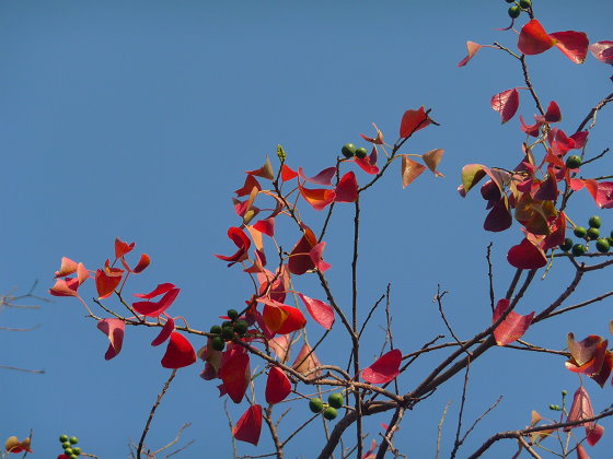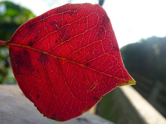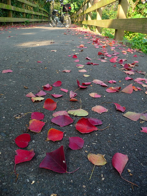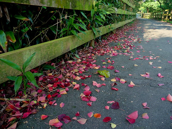 自行車道上有一顆烏桕,年年冬季落下濃濃的紅葉子
