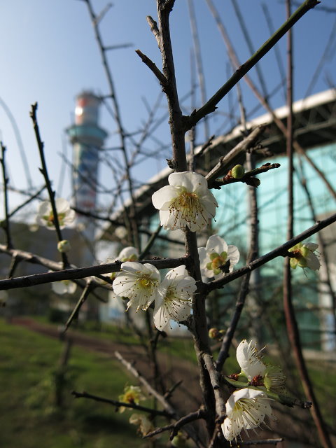五分港自行車道出入口在洲美焚化爐邊,洲美運動公園泳池後面,小山、球場、步道...一應俱全,只是鮮少遊客駐足。從洲美的田園走過烏桕老樹,來到焚化爐前,差不多將走完自行車道。冬天我特別喜歡騎車至此,賞烏桕落冬葉,還有梅花撲鼻香。運動公園梅花也是在單車旅程中無意發現,那年冬末春臨,剛巧碰上晚開的梅花滿樹綻放。低矮梅樹與高聳焚化爐煙囱兩相對望,一直到冬去春來。靠近梅樹,淡香悠悠,梅花綻放時,空 氣便開始飄著若有似無的梅花香。只要在焚化爐前轉個小彎,隱藏版的梅花與君同樂在冬季。