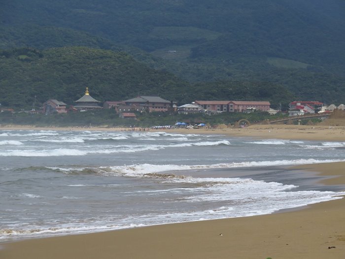 鹽寮線自行車道有二條路徑,濱海與林間線,沿著濱海線比較貼進大海,沙灘在綠叢外靜臥、海浪聲在不遠處呢喃!這裡要走進大海很簡單方便,找到小開口,慢慢推著單車,就可以來到一望無際的沙灘上。沙岸貼著地形蔓延,從福隆小村子外的海水浴場往澳底擺動迤邐線條,站在海邊凝望,像一條金黃色絲帶,連接著大海與陸地,好開闊、好舒心,有一種無法形容的壯麗。我們在沙灘上奔跑、跳躍,毫無顧忌躺在微濕、微溫的海沙上,把心烘得暖熱,青春年少的日子彷彿又回到心裡放在手上,任意揮灑。