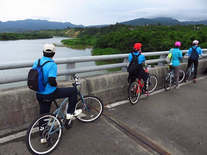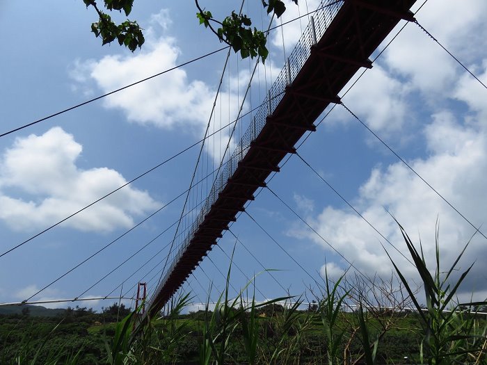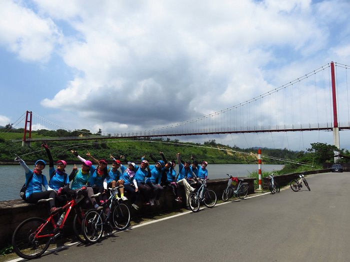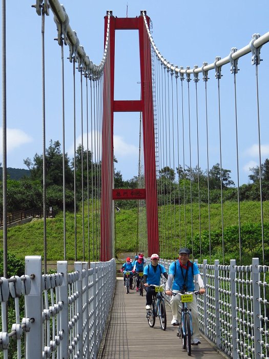 鹽竂線自行車道不怎麼長,來回大約只有13公里,比起草嶺舊環狀線,多了幾分不趕路的悠閒與自在,我們可以騎得很慢很慢,用慵懶的心情渡過最慢的一天,走走停停,為旅程中的每一刻留下最美的回憶。路過台2線,福隆遊客中心裡面很清涼,沒錯,今天不但藍天白雲,而且是個豔陽高照的日子。走進遊客中心,閱讀屬於在地說明,整理好心情再出發。大約一公里左右,右轉龍門吊橋,大紅色橋柱子拉住一條又一條鋼索,站在橋上,眺望雙溪出海口,橋上的風搖搖晃晃卻安安穩穩,帶我們輕踩單車掠過雙溪河上的每一吋美麗。有個很陡的小斜坡可以通往橋下,佇立橋下仰望,原來自己曾經駐足眺望的地方很高、看得很遠。站在不同的角度看見不一樣的風景,不一樣的心情過一樣的日子,說不定會更美、更壯闊,晚了一個星期來,雨天幻化成晴天,不就是最好的証明!坐在岸邊,輕眺遠方,我們是吊橋、夏天、河海風景的一部分,還有十幾顆快樂的心,今天的龍門吊橋下有一幅從未見過的快樂美景。