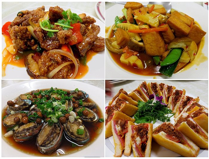 糖醋排骨、鐵板豆腐、鮑魚、有海鮮的三明治