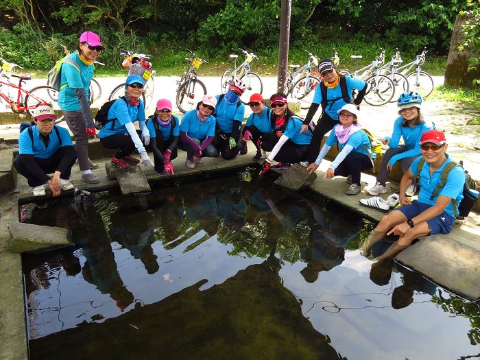 橋邊上的小路很陡,大家牽著單車,來到橋下的冷泉泡腳
