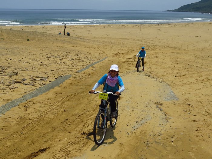 這裡要走進大海很簡單方便,找到小開口,慢慢推著單車,就可以來到一望無際的沙灘上