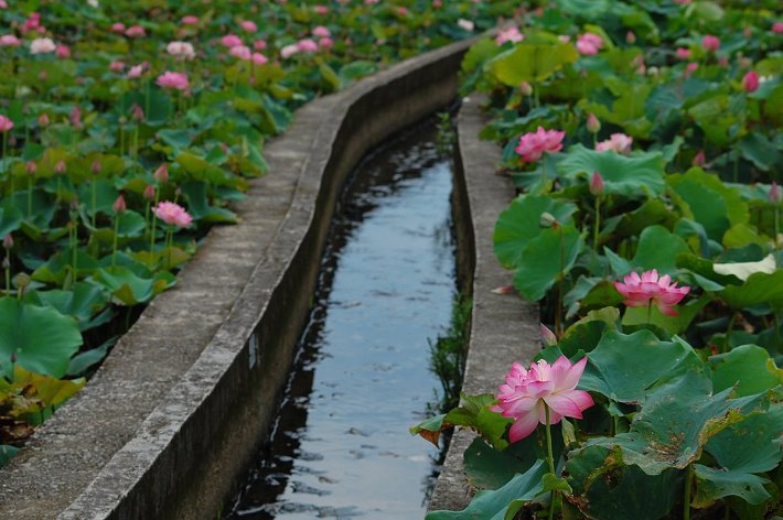 這一大片荷花田大約在金山清水磺清橋旁的清水溪畔,清水路60巷靜悄悄地從邊上經過。來到金山,只要看見磺清橋,大概就能找到這一方牡丹蓮盛開的濕地了。前幾年小白鶴也來此做客,漸漸的住在田間野地,引來大批人潮及議論。比起候鳥的遷徙只為延續安生立命的本能,人類真的太複雜了。我把單車停靠路旁,往荷田漫步,沒有太多陽光直射的田裡,一朵朵牡丹蓮還是挺直腰桿,往天際伸展。透過雲層的晨光,比較均勻,從天上灑了下來,落在我從來沒見過如此密集的牡丹蓮花海上,那光線強度剛好,不刺眼又不耽弱,粉紅花色更有一分文弱氣質,秀氣的美直讓人愛在心坎裡。以前拍荷花常覺得花太少、太遠,今天的花不但開得完美,數量也多,幾乎沒有可以挑剔的景色,反而讓手中快門不知要如何堅定的按下去。面對繁華綠叢,像失去重心的快門,不如收起相機,清風中慢步、荷香中吐納,賺得一天舒心清早,也不失為旅程中美好的收穫。在田埂上移動時刻,有一段短暫的陽光露出,這時候心都慢了,緩緩的牽起來自城市的心緒,舉起相機,擁抱晨光中的美麗。