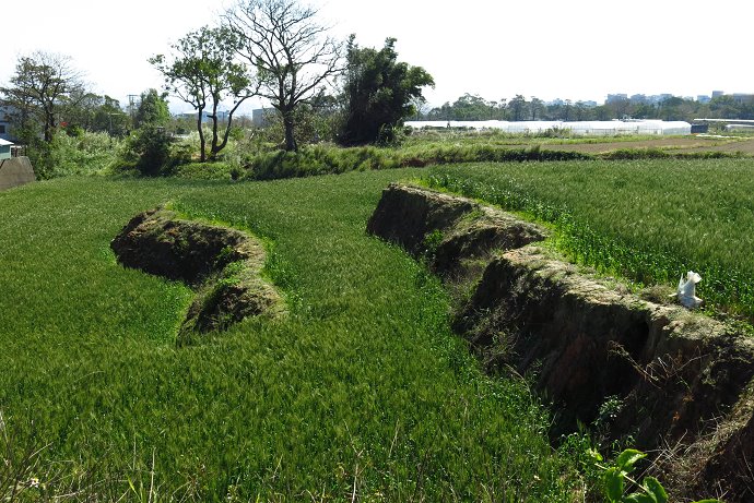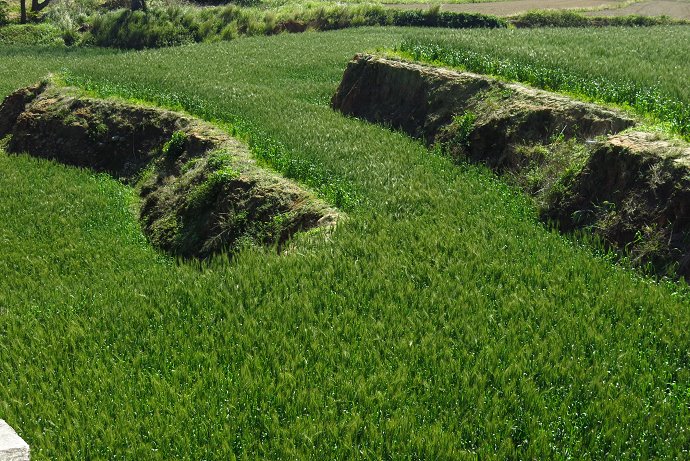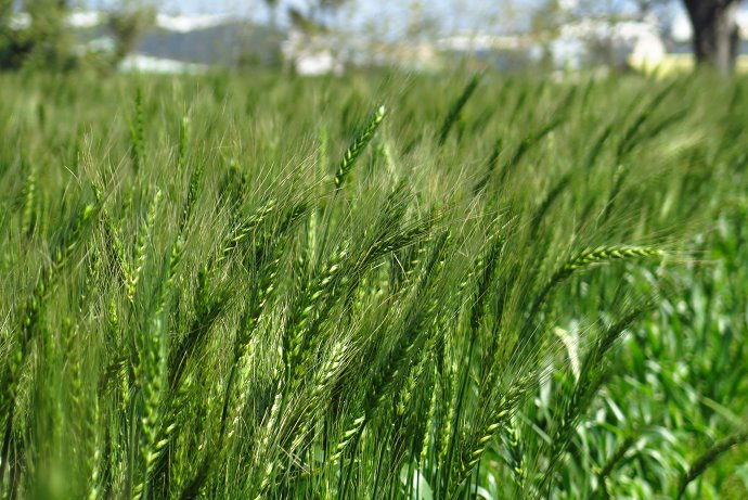 迎風擺動的麥穗藏在自行車道的坡坎下,春天的麥穗漾著輕綠