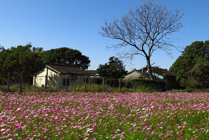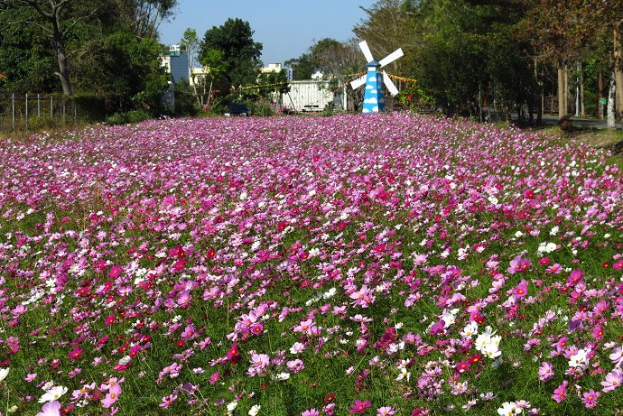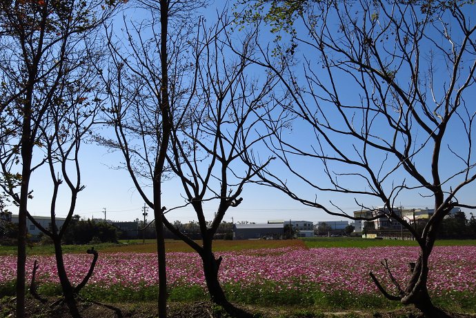 掠過冬季黃褐色的樹林隧道,一旁是五彩繽紛的大波斯菊花海
