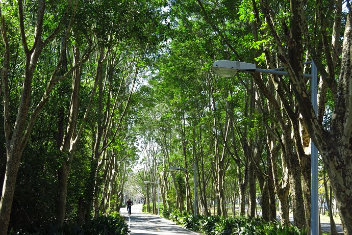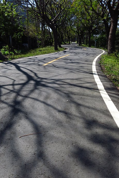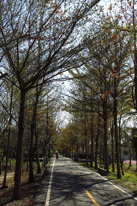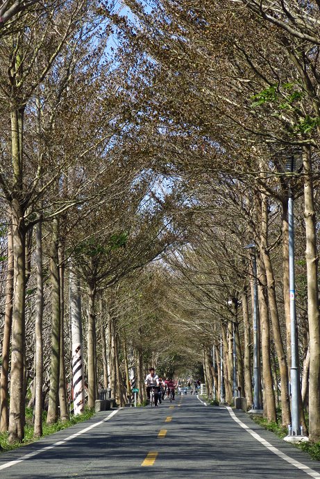 小葉欖仁交錯著青楓,潭雅神自行車道上,不同種類的樹蔭,搭成多變的綠色隧道,綿延十公里左右。不過在冬末早春時節,正是這些綠色隧道展現另一種風采的的時刻。