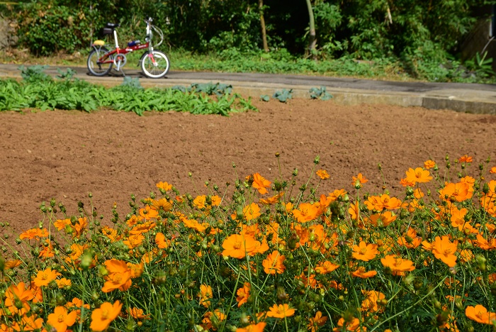 另一端在大田寮,騎出自行車道後會遇見三和社區的車薪路(北14),附近一派自然風情裡鋪著鄉間氛圍,水田處處、飛鳥成群,幾幢紅磚厝前波斯菊遍開。雖然不是自行車道,卻也沒什麼遊客與城市呼嘯的車輛。從靜謐走進了寧靜,就等小白鶴低空飛過,停佇在水天相映的田間美景裡。