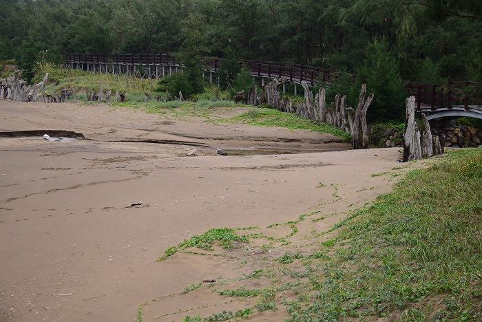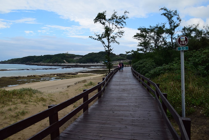 那天我開車帶著腳踏車,從三芝的車薪路轉進大田寮,一陣小小的迷路看見不少鳥友架著大砲,莫名中問見小白鶴定居的事情。附近的田鄉風情讓人傾心,我迫不及待想卸下單車徜徉連侯鳥也不想離去的美麗景致。為了不妨礙交通,我還是從不遠處的白沙彎,沿著大海風情自行車道開始充滿靜謐的單車旅程。石門端大約位於麟山鼻漁港,停好車很快的就可以展開單車之旅,雨後的木棧道往前方延伸,像大海一樣摸不著邊際的深遠,單車在沙灘上踩踏,揚不起沙塵,卻可以收拾起滿地的美景,裝進自己的心裡。視野略為墊高、輕輕下傾,換來眺望大海最棒的免費門票,偶爾欄桿會開啟一扇門,給你一個幾步距離的樓梯,停好單車走個二三步,一下子就投入大海與沙灘的懷抱。在台北,這麼容易親近大海的自行車道,大概只有風芝門了。往前走,沒多久,回眸凝望,沿途走來的木棧道,清清楚楚的在沙灘上劃出一道身心舒徐的線條,大海的味道、荒漠的風情、還有乘風而過的影子,在木麻黃樹林子下寫故事。