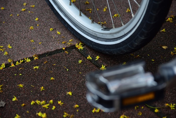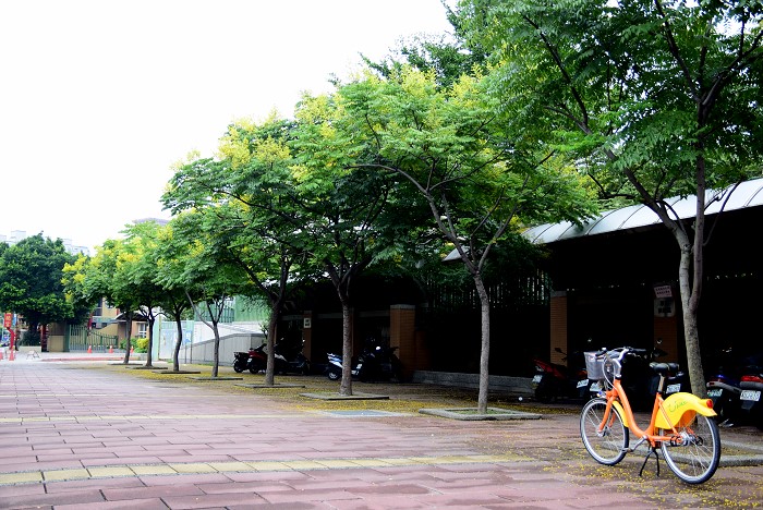 宮口街走出來,往北門街漫騎,中正路口板中後方的台灣欒樹,落了一地秋色