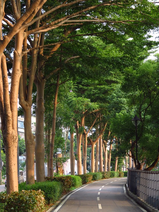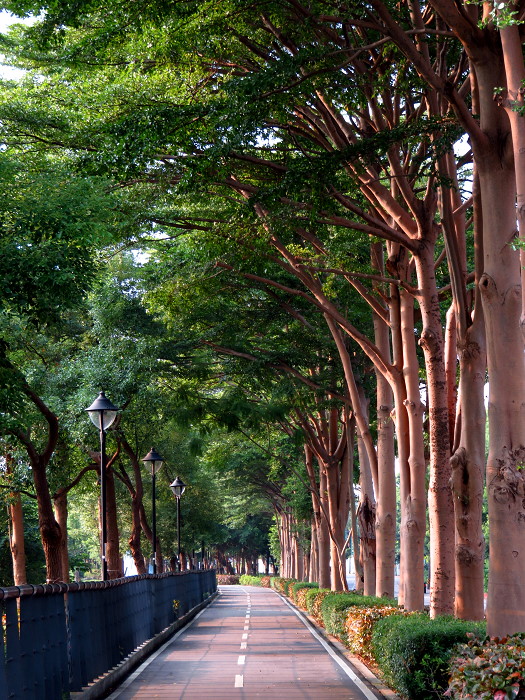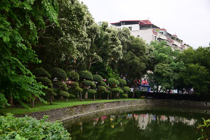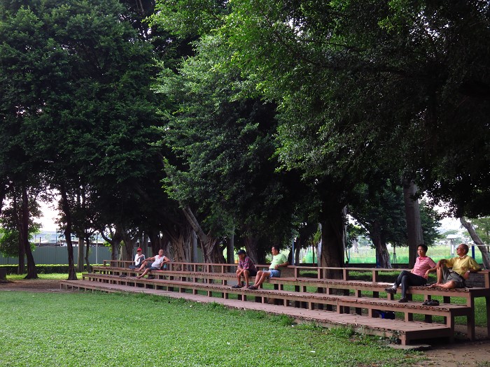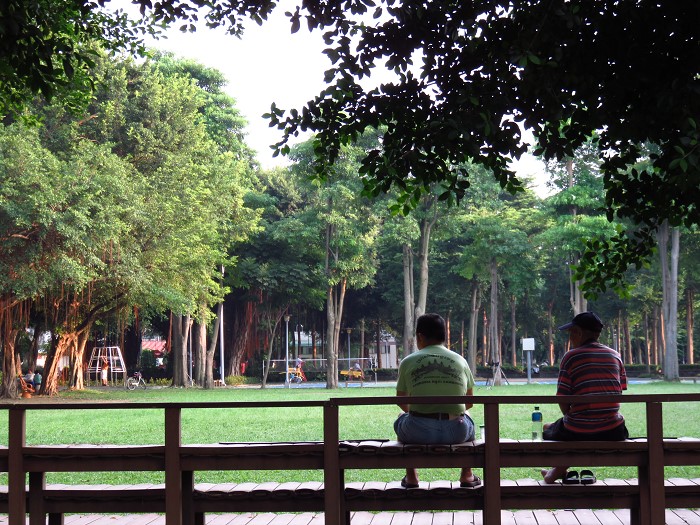 依照北門街口的枋橋古城示意圖,我劃過的北門街與西門街,再從館前西路回到南門街過去繁榮的老市街,大約就是枋橋古城的範圍。一座被城市遺忘的古老城市,其實我也忘了它陪我成長的回憶。離開古今交錯的城裡,循著湳仔溝自行車道騎上一小段林蔭午後,頭頂的小葉欖仁又濃密了一點,綠色隧道的視野很舒服,往前延伸直到光明的盡頭,我轉進小巷子,路過國光公園,看見大樹下的老人家度過悠閒的午後時光。