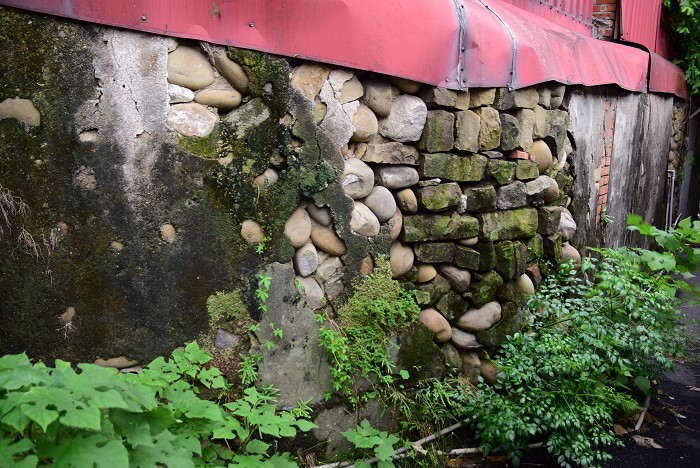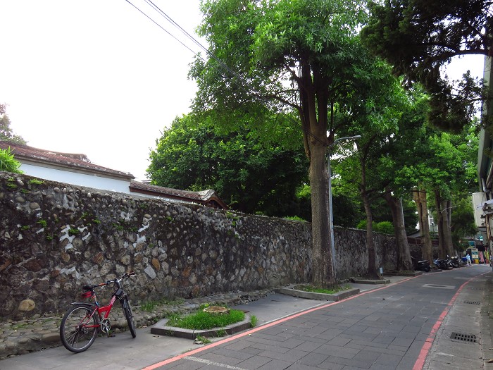 西門路上的人行道頗為寬敞,路過文昌街口,林家花園靜臥在左手邊古老的牆桓裡面,亭台樓閣、山水池魚,美輪美奐的古典建築,收藏了多少板橋城裡的故事!林家花園大門前不能停單車,我把單車停在一整排白千層的街角處,然後漫步走過再次出現的古城界址,穿梭時光般的遊歷林家當年的風華日子。來青閣、月波水榭、榕蔭大池、敬字亭 . . . 突然想起了,林家當年捐建台北府城小南門,南來北往的歲月更迭。林家花園邊有個林園停車場,聽說遺落了一小段古城牆,慢步走過整齊的停車位,那一整排現代汽車後方,卵石與方正的城牆石交壘出一小面牆,看來老有年紀。牆上壓著現在城市常見的鐵皮屋,板橋的歷史,斑駁如昔。