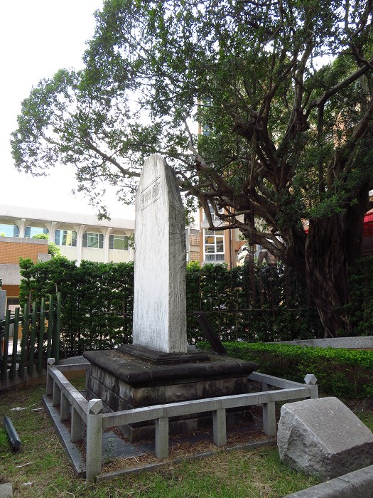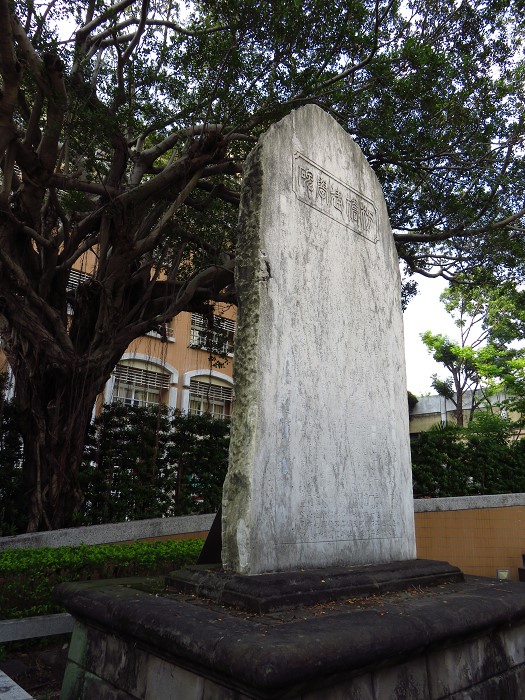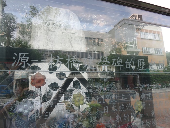 沿著文化路來到板橋國小,玻璃牆裡佇立著枋橋建學碑