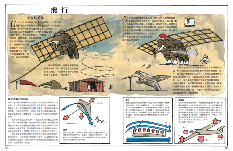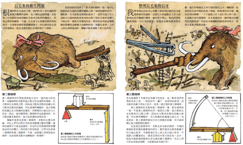 答:用長毛象開場其實是個意外插曲。當我在設計簡易機械的介紹頁時,這也是每一單元的開頭,我才發現有些我們常用的器材,其實自山頂洞人就開始使用了。我覺得用山頂洞人介紹這些機械器材應該滿有趣的,畫圖時,背景便約略的畫了些樹木,還有一隻好奇觀望的長毛象。接著我又想,嘿,如果讓長毛象跟山頂洞人間有些互動,不只好玩,還能傳達科學知識,於是長毛象就出現了。我本以為長毛象只會出現在簡易機械類的章節,但大家在看到長毛象後都很興奮,堅持長毛象應該出現在書中的每個單元。我說,等等,連數位領域等的單元等都要由長毛象介紹嗎?大家心照不宣的點頭稱是。就這樣,長毛象貫穿本書。這真是個非常正確的決定。長毛象的存在,改變了知識的重量與結構,這影響對年紀較小的讀者尤其明顯。