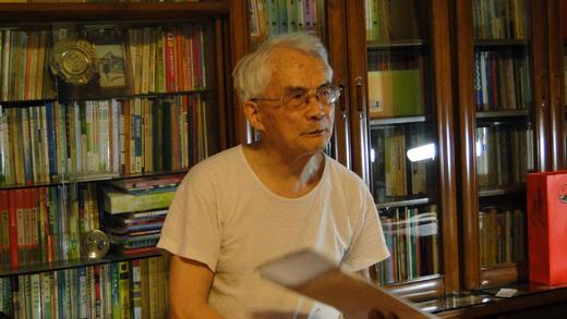老人的書房約莫7、8坪大,除了一張床、一組藤椅、書桌,四桌全是書櫃,連床頭也是一排排書,而這些書又幾乎全與詩相關。當他知道我們來自台灣,更興奮的要我們代向林煥彰老師和林良先生問好。