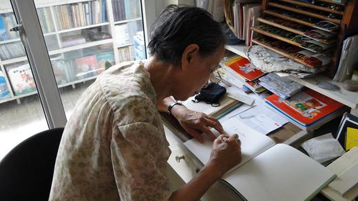 老人目前蟄居先前少兒社單位公寓的六樓,房間並不寬敞,但她打理得整齊有序,多數的圖書擺在陽台的書櫃裡,書櫃上擺滿盆栽,看出去滿眼綠意。她的書桌不大,畫筆畫具依序放在一格格的小櫃子裡,畫畫時拉出小畫板,一張張讓小讀者喜愛的插圖便這樣誕生了。雖然不是科班出生,也沒有受過專業訓練,但她憑著對美術的愛好,不僅勤於觀察,勤於練功,勤於看展覽,更努力蒐集材料,在她小小的工作室裡,我們就看到了不少各種偶和稀奇古怪的民藝品。