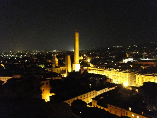 終於到了頂樓,視覺豁然開朗,整個波隆那市區,幽靜的蜷臥在我們腳下,市標雙塔就在距離不遠的地方。往天頂看去,星星清晰可辨,獵戶座在偏南的天空,北斗七星則高高懸掛。塔頂風雖大,但感覺並不寒冽。