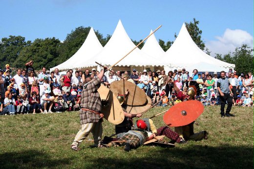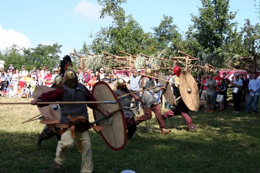 這是瑞士居爾特人節的圖片,在這種節日裡傳統式的打鬥也是重點之一,看看他們的服裝與裝備的樣式似乎是西元前200到300年左右的,跟同期的羅馬軍裝相似,武器則以長矛為主,只有在近距離肉搏戰才用刀劍。