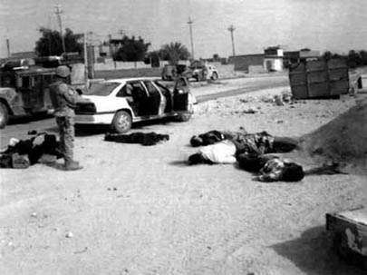 有照片顯示了路邊炸彈襲擊造成的彈坑以及美軍被炸毀的軍車。在路邊炸彈襲擊中,一名美海軍陸戰隊下士身亡,這也導致了哈迪塞慘案的發生。一張照片顯示,一名伊拉克小男孩身著睡衣仰面朝天躺在地上,臉和頭部滿是血污,美軍的一架直升機停在小男孩屍體的旁邊。還有一張照片,一位年輕的母親躺在床上,雙手伸開,三個子女的屍體蜷縮在這位母親身體的右側。