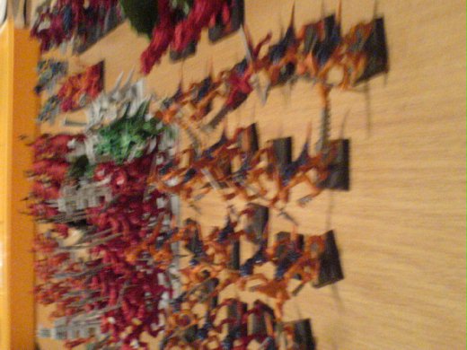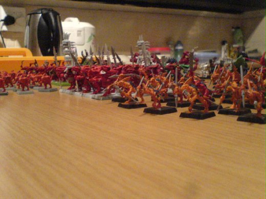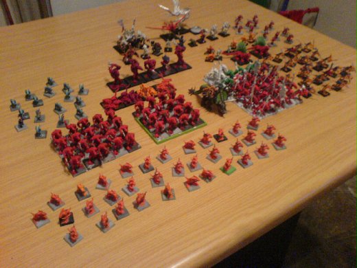 這是我的Lizardmen兵團,但是並不是我從頭開始收集的。當初有一位玩家變賣了他軍隊,我就把其中的Lizardmen買下來了,然後加上了一些新的模型而且順便把顏色改掉了,不過目前還沒有完成,所以看起來還很凌亂。不過,可別小看他們喔,在戰場上他們的表現還算不錯呢。