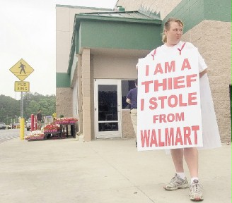 46歲的麗莎‧金‧費席安站在阿拉巴馬州阿塔拉市的沃爾瑪賣場門口,身上掛著「我是小偷,我偷了沃爾瑪的東西」的牌子。她被抓到偷竊一件7美元(約台幣234元)的商品,法官讓她選擇坐60天牢,還是在沃爾瑪門口掛牌罰站四小時。