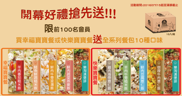 7/15活動開始,於樂淘官網購買快樂寶寶餐或幸福寶寶餐一箱(15包),加送您10種口味餐包各一包(10包),總計25包!