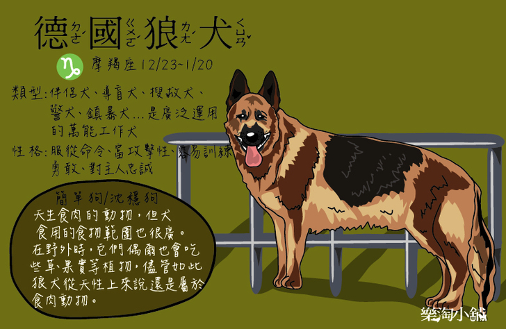德國牧羊犬又稱為德國狼犬,大家所熟知的是狼犬非常聰明,忠誠度與服從性極高,所以經常被軍警所用,配合執行搜查拯救與護衛等任務。狼犬的智商在世界犬類中排名第三,工作能力也是一級棒。 狼犬雖富有攻擊性,但在受到攻擊或防衛所需時才會展現敵意,其個性沉穩又有些冷漠,不容易與陌生人接近,工作謹慎耐心與盡責。