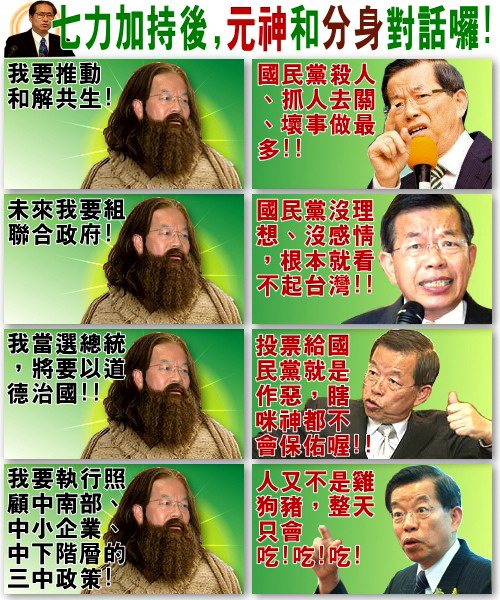 記者:根據美國法律,一年不用綠卡並且不到美國,綠卡就失效了,但國民黨的黨章規定如果不被開除或主動申請退黨就還是國民黨黨員。你身為民進黨主席,卻依然是國民黨黨員,這是表示你要「藍綠和解」還是表示你隨時準備變節?