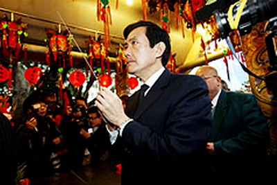 【下圖一】馬英九在228紀念公園褔德宮進香追思。
