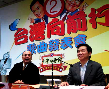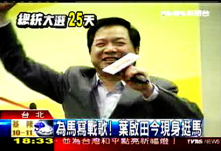 為馬寫戰歌!葉啟田現身挺馬為馬蕭拼本土選票,國民黨二十七日舉行記者會,以「愛拼才會贏」走紅的寶島歌王葉啟田,為馬英九量身打造台語競選歌曲「台灣向前行」,葉啟田還親自出席國民黨舉行的新歌記者會,現場高歌。